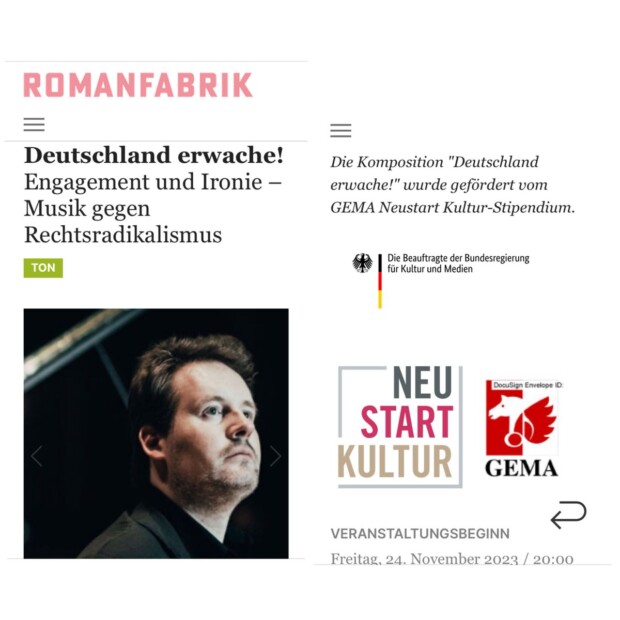Relativ anlasslos schrieb beziehungsweise sang „Deutschland erwache“ 2023 auch ein Antifa-Künstler, das heißt, einen ganz allgemeinen Kontext gab es: „Engagement und Ironie – Musik gegen Rechtsradikalismus“. Dafür kassierte er kein Ermittlungsverfahren, sondern eine Förderung aus dem „Neustart Kultur“-Topf der damaligen Bundesministerin für Kultur und Medien Claudia Roth.