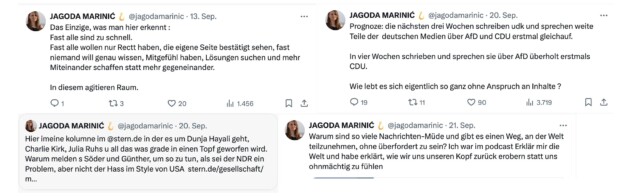 Früher gab es wenigstens im Kulturjournalismus Spott, Boshaftigkeit und subkutane Botschaften. Heute heißt die „Journalistin des Jahres in der Kategorie Kultur“ Jagoda Marinić, Kolumnistin beim Stern und Verfasserin des Buchs „Sanfte Radikalität“. Beides klingt schon schlimm genug. Aber weder das eine noch das andere bereitet ein ahnungsloses Publikum, das noch nichts von ihr kennt, auf ihre Tweets vor, also auf ihre authentischen, von Korrektoren und Lektoren noch unoperierten Wortmeldungen. Die sehen nämlich so aus: