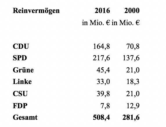 Die starke Zunahme der Parteivermögen in den letzten Jahren entspricht einer langjährigen Entwicklung. Von 2000 bis 2016 wuchsen auf Basis der Buchwerte laut Rechenschaftsberichten die Parteivermögen [Angaben ohne AfD, da erst 2013 gegründet] von 281,6 Millionen Euro auf 508,4 Millionen Euro (= 80,5 % Erhöhung).