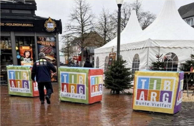 Dazu kommt noch eine saisonale Welle. Beim Spiegel gleich nebenan in Hamburg-Niendorf entdeckten die Wintermarktorganisatoren, dass sich Betonsperren auch als Werbeflächen nutzen lassen:
