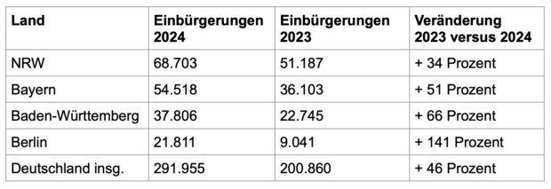 Die Zahlen explodieren: Laut Statistischem Bundesamt haben im Jahr 2024 insgesamt 291.955 Ausländer die deutsche Staatsbürgerschaft erworben. Damit stieg die Zahl der Einbürgerungen gegenüber dem Vorjahr um 91.860 oder fast die Hälfte (+ 46 Prozent) auf einen neuen Höchststand. Am häufigsten wurden im Jahr 2024 Syrer eingebürgert: 83.150 Personen oder 28 Prozent von allen Einbürgerungen. In einzelnen deutschen Ländern gab es noch höhere Steigerungsraten.