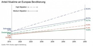 Das große Szenario führt 2050 zu geschätzten 17,5 Mio. Muslimen in Deutschland – ein Anteil von fast 20%. In ganz Europa käme man „nur“ auf einen Bevölkerungsanteil der Muslime in Höhe von 14% – Schweden hingegen auf unglaubliche 30,6%.