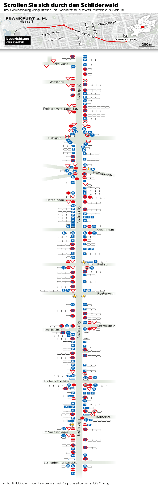 Nach dem „Masterplan“ sollen 80 Prozent aller Wege durch Frankfurt bis 2035 zu Fuß oder mit dem Fahrrad zurückgelegt werden. Erzwungen wird das knallhart: Autospuren kommen weg, stattdessen gibt es Radspuren. Parkplätze verschwinden, bestehende werden massiv verteuert. Bisher kostenlose Parkplätze sollen künftig Geld kosten. Dazu kommen Tempo-Limits: 20 bis 40 km/h. Die entsprechenden autoarmen/autofreien Zonen werden mit Hunderten von Verkehrsschildern „verschönert“. Kafkaeske „Schild“-Bürgerstreiche anno 2025! Beispiel: 1100 Meter des 1350 Meter langen Grüneburgwegs im betuchten Westend werden zur Fahrradstraße umgebaut. Dazu gibt es 566 Schilder auf 1100 Meter Länge. Bis zu sechs Stück hängen an einem Mast.