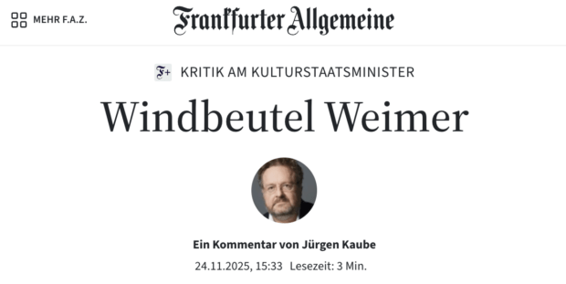Einen Tag, nachdem Merz alle Kritik an Weimer für „haltlos“ erklärt, zieht sich nun die FAZ – bislang nicht nachvollziehbar freundlich und die Skandale ignorierend – auffallend scharf von Weimer zurück und gibt dabei Merz noch einen mit. FAZ-Herausgeber Jürgen Kaube hält fest, was Merz nicht sehen will: „Friedrich Merz findet, alle Vorwürfe gegen Wolfram Weimer, seinen Kulturstaatsminister, hätten sich als falsch erwiesen. Womöglich kennt er sie nicht, wenn er das denkt.“ In einem einzigen Satz sind damit zwei Ebenen markiert: die Distanz der FAZ zu Weimer und die Distanz des Kanzlers zur Realität (die auch der FAZ bis dahin fehlte).