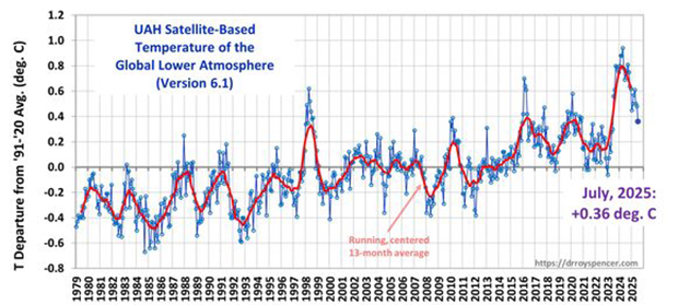Die Medien berichten vom drittwärmsten Juli aller Zeiten, doch die erste Grafik zeigt: Die globale Mitteltemperatur sinkt in diesem Jahr rapide. Die Abweichung vom langjährigen Mittel der Satellitenmessungen beträgt nun 0,36 Grad Celsius.