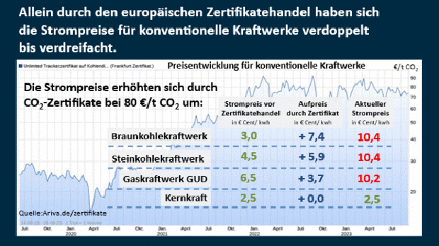Damit sind die CO2-Zertifikate die wesentliche Ursache der zwei- bis dreifach so hohen Industriestrompreise Deutschlands gegenüber den USA. Hinzu kommen noch die Netzkosten aufgrund des Ausbaus der erneuerbaren Energien von einigen hundert Milliarden Euro.