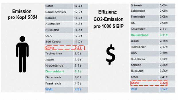 Die EU macht 6,4 Prozent der weltweiten CO2-Emissionen aus, die restlichen Industriestaaten kommen auf 7,1 Prozent der CO2-Emissionen. 86,5 Prozent der weltweiten CO2-Emissionen können also nach dem Pariser Abkommen unverändert bleiben oder wie im Falle von China und Indien ungestört weiter wachsen. Deutschland will bis 2045 500 Millionen Tonnen CO2 einsparen. Das entspricht dem Zuwachs der CO2-Emissionen in Indien und China in zwei Jahren. Auf dem deutschen Weg zur CO2-Nullemission im Jahr 2045 verlässt jegliche Produktion Deutschland. Wächst sie in den USA oder in China auf, erhöht sie dort die CO2-Emissionen auf das 2-Fache (USA) oder 4-Fache (China), wie die nächste Grafik zeigt.