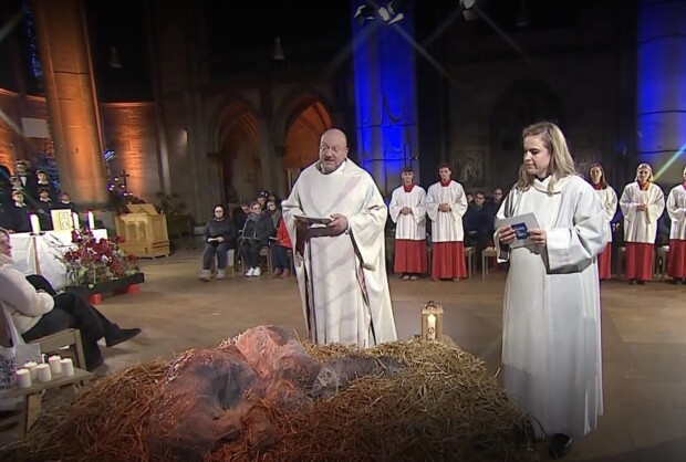 Beispielhaft steht für diese bewusst betriebene Ent- und Verfremdung von Weihnachten die lebendige Krippendarstellung, wie sie die katholische St. Mariengemeinde Stuttgart im Fernsehgottesdienst der ARD am Heiligen Abend präsentierte: Ein echter Mensch lag dort nackt auf Heu und Stroh – allerdings in Reispapier gewickelt, so dass er aussah wie ein schleimiges, alienartiges Lebewesen.