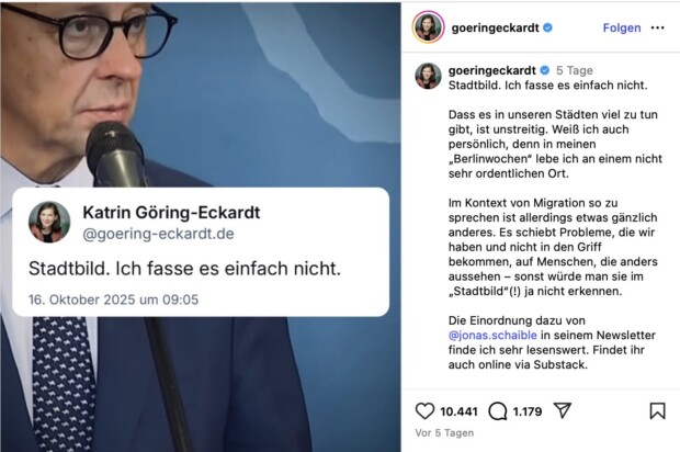 Es gibt übrigens nicht wenige Migranten, die sich zum einen an diesen Stadtbildern stören, und zum anderen wissen, dass Merz nicht sie meint – also diejenigen, die ausdrücklich in einem westlichen und geordneten Staat leben möchten. Genau diejenigen müssen sich von Linksweißdeutsch öffentlich zurechtweisen lassen, in diesem Fall von einem „Volksverpetzer“-Typ, weil sie sich nicht in eine Inszenierung einfügen, die für einen großen Teil des politisch-medialen Raums mittlerweile die real existierende Gesellschaft ersetzt.