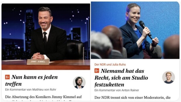 Laut Spiegel und anderen Organen marschierte die Trump-USA mit der sechstägigen Sendepause für Jimmy Kimmel bei dem privaten Sender ABC den nun wirklich allerletzten Meter in den Faschismus. Bei der dauerhaften Absetzung der mäßig konservativen Moderatorin Julia Ruhs beim Zwangsbezahlsender NDR wegen der Abstoßungsreaktion, die sie beim lauten und gut organisierten Teil der Belegschaft auslöste, handelt es sich dagegen laut Katrin Göring-Eckardt um „einen ganz normalen Vorgang“.