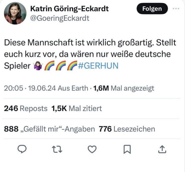 Die Überrepräsentation bestimmter Migrantengruppen in der Kriminalstatistik liegt an der verzerrten Statistik beziehungsweise daran, dass überhaupt jemand zählt; dass zehntausende Jobs in der Autoindustrie verschwinden, rührt wiederum daher, dass die Unternehmen nicht genügend Elektroautos auf Halde bauen, die hohen Energiepreise kommen davon, dass noch nicht genügend Windräder auf den Feldern stehen. In dieser Welt erregt sich auch eine prominente Grünenpolitikerin, die während der EM Fußballspieler öffentlich nach Hautfarbe in Qualitätsklassen einteilte, über das angebliche rassistische „Stadtbild“-Wort.