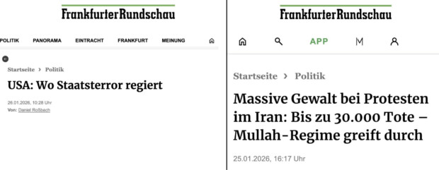 Die Frankfurter Rundschau nennt das Vorgehen der ICE-Beamten in den USA „Staatsterror“. Für die Ermordung von etwa 30.000 Oppositionellen durch das theokratische Regime im Iran findet das gleiche Blatt die Formulierung: Das Mullah-Regime „greift durch“.