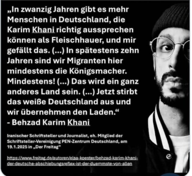 Irgendwelche Proteste dagegen in Politik und öffentlich-rechtlichen Medien regten sich dagegen nicht, auch der Verfassungsschutz nahm sich der Sache nicht an, obwohl Khani ja eindeutig zwischen Herkunftsdeutschen und den anderen unterscheidet. Es kommt eben nicht nur darauf an, wer gerade spricht, sondern auch, welche Perspektive jemand aufzeigt.