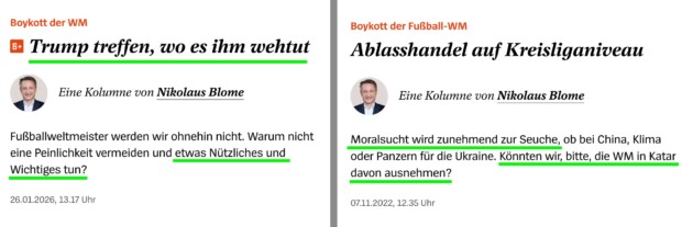 Einen Boykott der Fußball-WM in Katar – einem Staat, der im Ruf steht, weltweit Islamismus zu fördern – fand ein Spiegel-Journalist 2022 ganz und gar unpassend. Dass die deutsche Mannschaft dem Turnier in den USA fernbleiben sollte, um ein Zeichen zu setzen, hält er dagegen für moralisch nahezu zwingend.