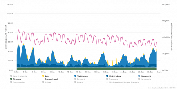 Na ja, da muss ich Ihnen widersprechen, deutlich ist das nicht zu sehen, es ist eigentlich überhaupt nicht zu sehen: Wir haben einen warmen, windigen Jahreswechsel mit einer denkbar geringen Last zwischen 40 und 50 GW, alle Kraftwerksblöcke langweilen sich, es gibt aktuell Störungen oder Leistungseinschränkungen, in den Nachbarländern sieht die Situation ähnlich aus. Heute Vormittag / Mittag gab es mal ein Import-Saldo von bis zu 2 GW, das ist jetzt aber auch kein Aufreger, es war einfach nichts los. Warten Sie mal ab, wenn wieder Minusgrade sind und die Restwirtschaft versucht zu brummen, dann sehen Sie, wie der Anteil… Mehr