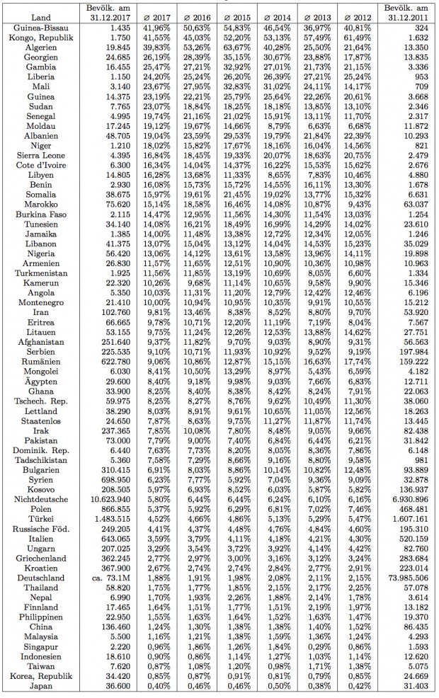 Man sieht, dass die Kriminalrate vieler Länder leicht rückläufig ist. Am auffälligsten ist der sehr starke Rückgang auf sehr hohem Niveau von Algerien von über 53% auf unter 40%. Gleichzeitig nahm aber die Anzahl in Deutschland wohnhafter Algerier innerhalb nur eines Jahres um fast 1.500 ab, also um fast 7%. Der Abgang ist dabei geringer als der Rückgang der Tatverdächtigen (ca. minus 3000), es scheint daher, als ob hauptsächlich kriminelle Algerier das Land verlassen haben. Liegt dies etwa an konsequenter Abschiebung, Abschreckung, oder womöglich an Einbürgerung?