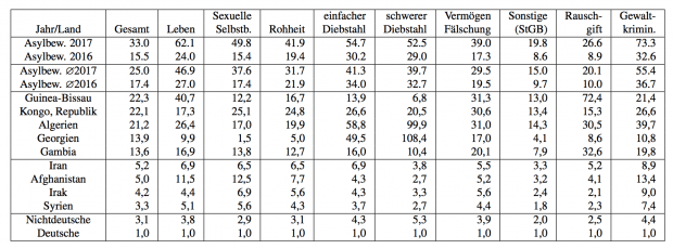 Zum Abschluss wollen wir noch erwähnen, dass manche Zahlen in der PKS unrealistisch zu sein scheinen. So stellen im Jahr 2017 International/national Schutzberechtigte und Asylberechtigte, Geduldete und Kontingentflüchtlinge zusammen nur 30,848 Tatverdächtige, obwohl diese Gruppe (d.h. alle „Zuwanderer“ ohne aktuelle Asylbewerber) zusammen mindestens 1,5 Millionen Personen umfasst. Am 31.12.2016 gab es 1.602.590 sogenannte Schutzsuchende, davon waren bei 572.545 die Asylentscheidungen offen [4], d.h. es gab ein anhängiges Asylverfahren, bzw. es wurde noch kein Asylantrag gestellt. 2017 wurden 603.728 Asylanträge entschieden [1]. Das heißt es gab Ende 2017 insgesamt 1.633.773 Schutzsuchende in Deutschland deren Asylantrag entschieden wurden (minus der 23.966 abgeschobenen und zusätzlich noch der eventuell freiwillig ausgereisten), im Jahresmittel also ca. 1,3 Millionen. Deren Kriminalrate wäre also nur ca. 2,3% und damit im Bereich der Deutschen und wesentlich niedriger als der Durchschnitt der Nichtdeutschen. Dies obwohl Iran, Irak, Afghanistan und Syrien 2017 allein bereits über 90.000 Tatverdächtige stellen und die meisten Flüchtlingsländer eine sehr hohe Kriminalrate haben. Ein entschiedener Asylantrag, gleich wie die Entscheidung ausfällt würde demnach ein Wunder bewirken: aus Kriminellen würden über Nacht Anständige. Diese Zahlen sind daher sehr unglaubwürdig und müssen in jedem Fall überprüft werden.
