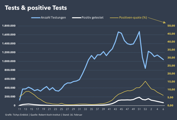 Gerald Groß, Chef der Deutschen Krankenhausgesellschaft, sagte der Welt: „Wir sind nicht überlastet“. Die Belegung der Intensivbetten insgesamt ist sogar unter dem Schnitt der Vorjahre. Etwas Gegenteiliges ist auch nicht zu erwarten: Denn nachdem die Politik es bis Dezember verschlafen hatte, hat sich der Schnelltest-Schutz in Heimen deutlich verbessert. Da von Bundesland zu Bundesland bis zu 90% der Toten aus Altersheimen kommen, wäre hier der entscheidende Schritt zu tun, der die Lage entspannen kann.