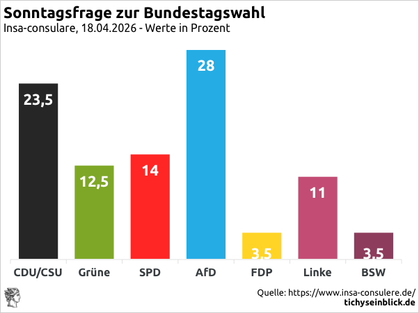 Wenn die Folgen der Regierungspolitik der Union Deutschland in voller Härte treffen werden, wird die INSA-Umfrage vom 28. April noch als gutes Ergebnis gelten, an das man sehnsüchtig zurückdenkt. Laut Ergebnissen der letzten Sonntagsfrage von INSA käme die AfD auf 28 Prozent der Stimmen, die Union nur noch auf 23,5 Prozent. Damit nähert sich die CDU von Friedrich Merz der 20-Prozent-Grenze und Friedrich Merz folgt Lars Klingbeil, dessen SPD bei 14 Prozent liegt, während die Grünen bei 12,5 Prozent und die Linken bei 11 Prozent stehen. Doch die Vereinigte Linke (SPD, Grüne, Linke) verharrt zusammen – noch – bei ca. 37 Prozent, wobei auch die Potentialanalyse zeigt, dass auch ihre Potentiale schwinden. Nur der AfD gelingt es, ihr Potential zu erweitern, das derzeit bei 35 Prozent der Stimmen liegt.