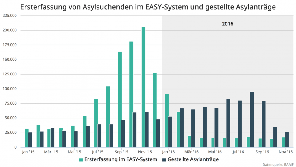 Im Zeitraum Januar 2015 bis November 2016 wurden in EASY fast 1,4 Mio. Personen registriert. Offiziell bekannt sind dem Staat offenbar ca. 1,05 Mio. Asylsuchende.