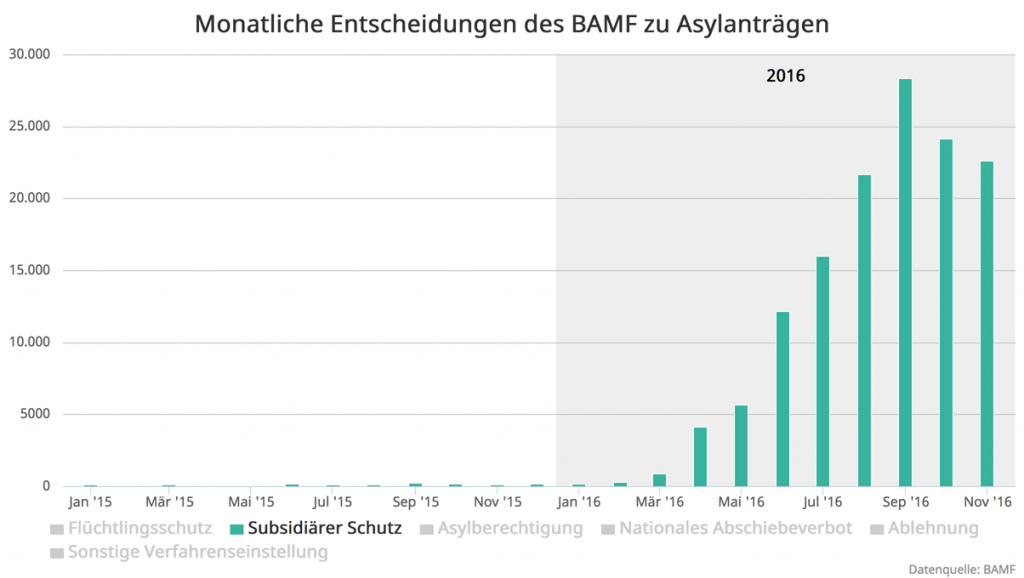 In einem vorangegangenen Artikel zu den BAMF-Zahlen hatten wir bereits das Thema des „subsidiären Schutzes“ erwähnt. Nach Einführung der Übergangsfrist von 2 Jahren (März 2016 bis März 2018) zum privilegierten Familiennachzug für diesen Personenkreis wurden vom BAMF deutlich mehr Entscheidungen in diese Richtung getroffen. Dieses Vorgehen blieb nicht unerkannt und wurde von Presse und Politik kritisiert. Zudem ist die Anzahl der Klagen gegen eine Einstufung als „subsidiär Schutzberechtigter“ angestiegen. Eine gewisse „Gegenreaktion“ des BAMF meine ich bei den Zahlen erkennen zu können (siehe folgende Grafik mit Fokus auf die Anzahl dieser Entscheidungen).