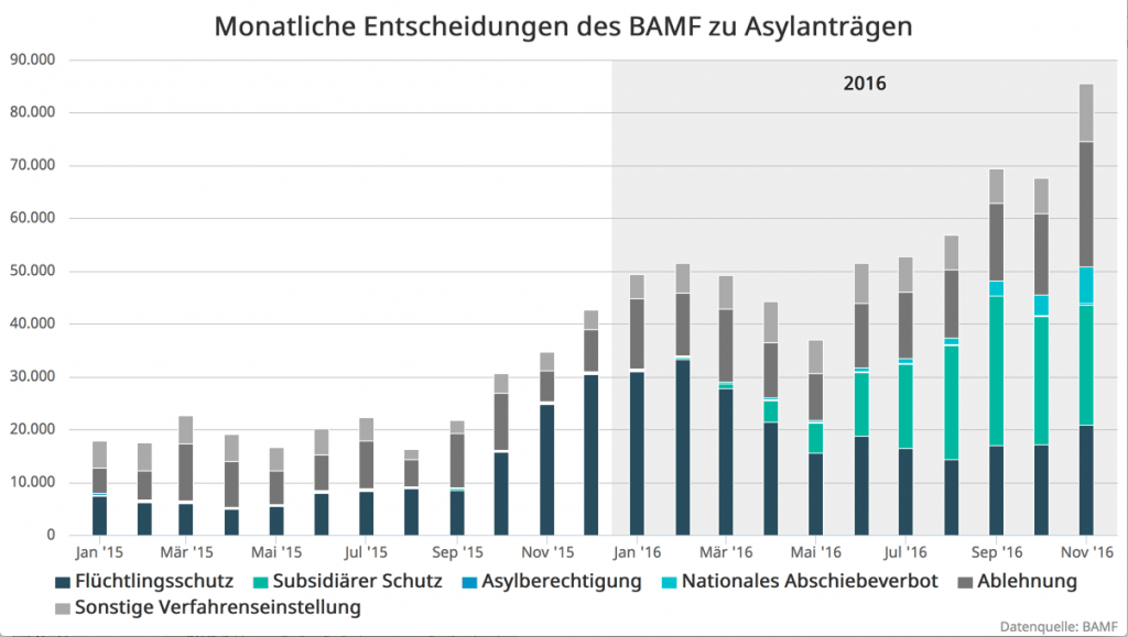 Nach offiziellen Angaben sind seit Anfang 2015 etwa 1,05 Mio. Flüchtlinge nach Deutschland gekommen. Am Freitag (09.12.2016) hat das BAMF seine Zahlen zum Stand per Ende November 2016 veröffentlicht. Die bereits im Vormonat verkündete Trendwende setzt sich fort. Die Anzahl der Antragsentscheidungen konnte erneut gesteigert werden und die Menge noch nicht entschiedener Anträge nimmt weiter ab.