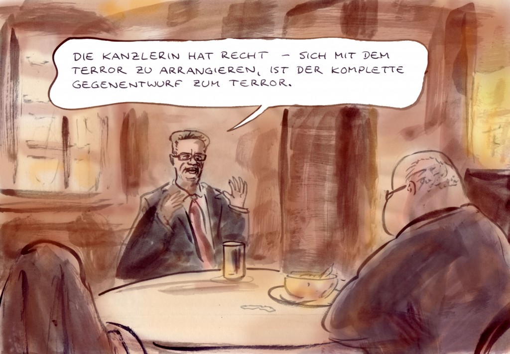 Die Bundeskanzlerin erklärt uns in ihrer Neujahrsansprache: „Indem wir unserem Leben und unserer Arbeit nachgehen, sagen wir den Terroristen: Sie sind Mörder voller Hass, aber wie wir leben und leben wollen, das bestimmen nicht sie. Wir sind frei, mitmenschlich, offen.“