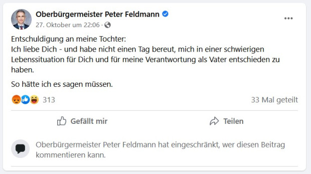Können Eltern ihren Kindern eine brutalere Wunde zufügen? Peter Feldmann versuchte sich am Freitag bei seiner Tochter zu entschuldigen. Mit einem Facebook Post.