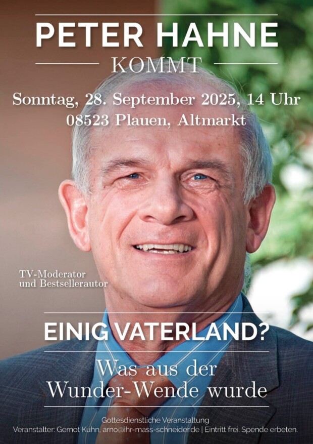 Apropos frühere DDR. Zum 36. Jahrestag der allerersten Demo am 7. Oktober 1989, die zur Friedlichen Revolution führte, wollen Christen in der Heldenstadt Plauen eine Kundgebung mit mir machen. Dort, wo alles begann. Am Sonntag, 28. September, 14 Uhr sprechen Zeitzeugen der ersten Stunde und Pastor Johannes Holmer, Sohn des Pfarrers, bei dem das Ehepaar Honecker 1989 Obdach fand.