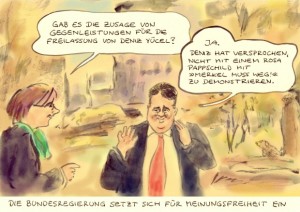 In Hamburg demonstrierte ein Frau mit einem Schild „Merkel muss weg“. Eigentlich ein normaler Vorgang in einer Demokratie. Während der Regierung Schröder/Fischer demonstrierten jeden Montag in dutzenden von Städten gegen die Hartz-Reformen. Man kann dafür sein, oder dagegen – so ist Demokratie. Nicht mehr in Deutschland. Der Demonstrantin in Hamburg wurden die Scheiben zum Kinderzimmer mit Steinen eingeworfen, die Reifen der Autos zerstochen, das Haus beschmiert. Bei der nächsten Demo waren 100 Bürger da und ein Heer von Gegendemonstranten. Die Merkel-Kritiker wurden mit Bussen der Polizei aus der Gefahrenzone gebracht. Vielleicht eine pragmatische Lösung – das Demonstrationsrecht aber sieht anderes vor.