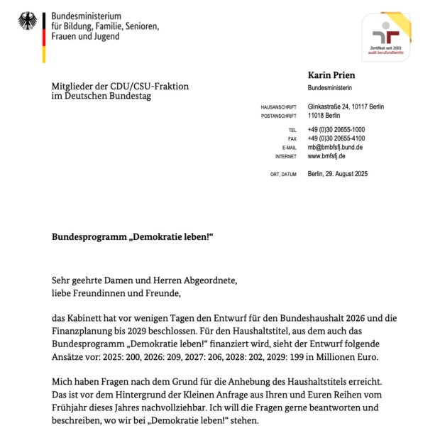 Die Bundesministerin für Bildung, Familie, Senioren, Frauen und Jugend, Karin Prien, hat gestern in einem Brief an die Abgeordneten der Bundestagsfraktion von CDU und CSU nicht nur ihre Absicht bekräftigt, das Bundesprogramm „Demokratie leben!“ fortzusetzen, sondern es sogar noch aufzustocken. Jedem Haushälter stockt der Atem, wenn Prien in einer Situation, in der für das Jahr 2025 noch kein Haushalt existiert, schreibt: „Der Aufwuchs der Haushaltsmittel, verbunden mit Effizienzreserven im bestehenden Programm, ermöglicht uns, diese neuen Ziele zu erreichen! Hier erbitte ich Ihre Unterstützung!“