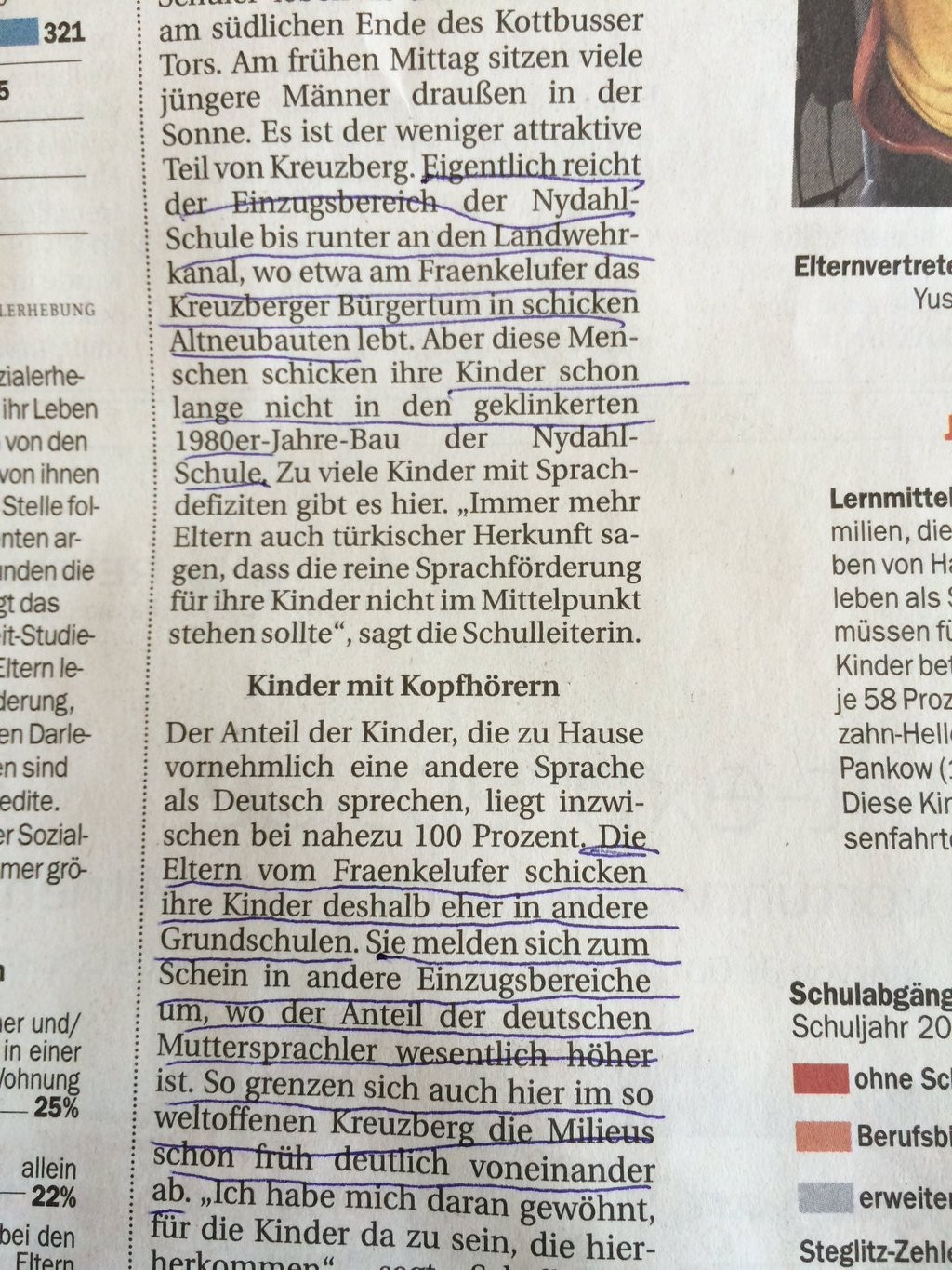 Genau genommen könnte man auch zahlreiche Menschen in renovierten Altbauwohnungen an den Kreuzberger Spreeufern und den neuen Edelvierteln wie Prenzlauer Berg so bezeichnen, die es bevorzugen, ihre Kinder lieber in kiezferne homogenere Schulen zu schicken. Oder ist das einfach nur bigott? Wasser predigen und Wein trinken – wie üblich? Dass etwas in Wahrheit nur für andere gelten soll, als das, was man für sich selbst in Anspruch nehmen möchte.