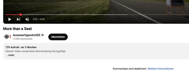Wie überflüssig so manche dieser PR-Aktionen des Auswärtigen Amtes sind, zeigt die Zahl der Aufrufe, die der Youtube-Kanal des Auswärtigen Amtes einsammelt: Baerbocks UN-Engagement wird mit einem Filmchen mit dem Titel „More than a Seat“ beworben. Aufrufe bei Redaktionsschluss dieses Beitrags: 729.
