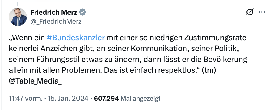 Als Scholz politisch am Ende war, sagte Merz im Bundestag: „Aber Sie können uns das alles auch ersparen und die Vertrauensfrage in der nächsten Woche hier im Deutschen Bundestag stellen.“ Später folgte der Satz: „Sie, Herr Scholz, haben Vertrauen nicht verdient.“