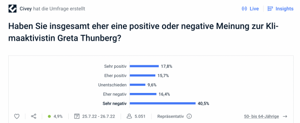 Auf eine Mehrheit der Bevölkerung in Deutschland scheint sich die Begeisterung von Medien und Politik für Thunbergs Botschaften bisher nicht übertragen zu haben. Das Meinungsforschungs-Institut Civey fragte am 25. und 26. Juli 2022 online nach der Meinung zu der FFF-Führungsfigur – und erhielt ein eindeutiges Ergebnis. Stand 26. Juli gaben 40,5 Prozent der Befragten an, ihre Meinung zu Thunbergs Wirken sei „sehr negativ“. Weitere 16,4 Prozent bewerten sie als „eher negativ“, 9,6 Prozent blieben unentschieden. Als „eher positiv“ sehen sie dagegen nur 15,7 Prozent der Befragten, als „sehr positiv“ 17,8 Prozent – genau ein Drittel.