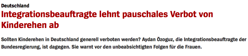 Umso erstaunlicher mutet in diesem Zusammenhang dann an, dass eine flächendeckende Kampagne gegen das lückenlose Verbot von Kinderehen trommelt. Die Integrationsbeauftragte der Bundesregierung, Aydan Özoguz (SPD) spricht sich gegen ein generelles Verbot aus. Sie führt Unterhalt und Erbansprüche an. Abgesehen davon, dass alle diese Rechte geklärt werden können, wenn der Gesetzgeber will: Ist das wirklich ein Argument? Ist das nicht eher eine Sklavenhaltung von Minderjährigen – Sex gegen Unterhalt? Sex gegen Geld – das ist die Formel für Prostitution. Erschütternd, dass die Politikerin einer Partei, die sonst in jeder Rede die Gleichberechtigung und das Binnen-i für geschlechtsneutrale Sprache hochhält, plötzlich die Zukunft von 12 oder 14-Jährigen dem Geld der reichen Säcke opfert. Auch Innenminister Thomas de Maizière will nur ein kleines Ordnungsgeld von 1.000 Euro verlangen, wenn Imame in Deutschland Kinder verheiraten – so billig ist es, wenn man dem Rechtsstaat Kinder abkaufen will. Und besonders perfide läßt die evangelische Kirche ihren Mediendienst evangelisch.de Wer Kinderehen anzweifelt, gefährdet, dass deutsche Homo-Ehen in Syrien und anderen muslimischen Ländern anerkannt würden – Mädchen-Versklavung als Preis für Homo-Ehen, die evangelische Form des Verschacherns von Menschen?