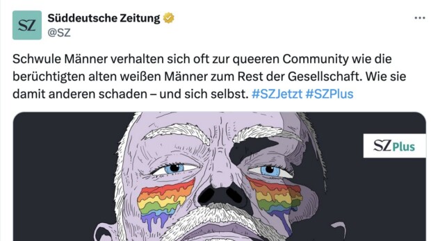 Und nun zum bisher eigentlich unantastbaren Hoffnungsrest in der überwiegend heillosen Großgruppe Mann: die Schwulen. Wenigstens die galten noch als halbwegs zuverlässig. Jetzt nimmermehr. Die Süddeutsche erklärte den G und LGBTQ* kürzlich zum alten weißen Mann innerhalb der Queerbewegung, also zu dem, der neuerdings nicht mehr mitzieht oder sogar sabotiert.