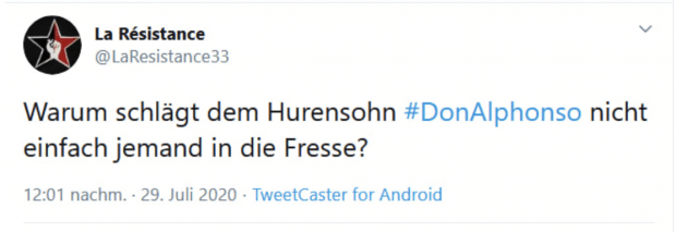 Gegen Leute, die auf Twitter fordern, einem Journalisten die Visage einzuschlagen, und die mit Brandanschlägen auf eine Redaktion drohen, helfen Strafanzeigen. Mit einer entsprechenden Vorstrafe kommt man schlechter an öffentlich finanzierte Jobs und Aufträge. Jedenfalls dann, wenn wiederum jemand vor dem Verwaltungsgericht dagegen klagt und Dienstaufsichtsbeschwerden schreibt.