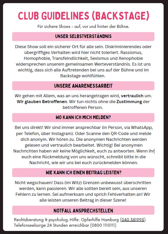 Das „Centralkomitee“ im Hamburger Stadtteil St. Georg, nahe der Alster, verfolgt ein ähnliches künstlerisches Konzept wie das „Gloria“ in Köln. Den woken Kampf gegen das offene Wort führt man dort weniger über die Vertragsgestaltung und mehr über Verhaltensregeln für den Bereich hinter der Bühne. Im hippen Neudeutsch nennt man das „Club Guidelines (Backstage)“.