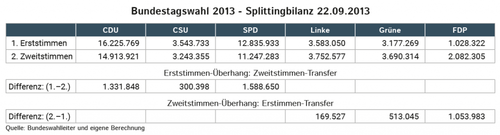 Nicht die alleinige wohl aber die wichtigste Ursache für die Überhänge ist das Stimmensplitting. Die Wähler sollen beide Stimmen im Verbund abgeben, also mit der Zweitstimme die Partei kennzeichnen, die sie auswählen wollen, und die Erststimme dem von der Partei im örtlichen Wahlkreis aufgestellten Kandidaten zukommen lassen (Personalisierte Verhältniswahl). Allgemein wird aber auch die gespaltene, die unverbundene Abstimmung als zulässig angesehen, die zu „Leihstimmen“ führen. Die „Leihstimmen“-Wähler splitten beide Stimmen und vergeben die Erststimme an den örtlichen Wahlkreisbewerber, die Zweitstimme aber an eine Konkurrenzpartei einer nachfolgernden Wunsch-Koalition. Man kann das aber auch umgekehrt machen und statt der Zweitstimme die Erststimme „verleihen“. Vom Stimmensplitting wurde 20012 in NRW lebhafter Gebrauch gemacht. Die Wahlprognosen verloren dazu kein einziges Wort und taten das auch bei der Bundestagwahl 2013 nicht. Dazu die nachfolgende Tabelle mit den entsprechenden Zahlen.