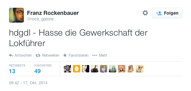 Bildschirmfoto 2014-10-17 um 11.08.15 Published on 17. Oktober 2014 in Die Selbstmord-Gewerkschaft – Bahnstreik X.0Full resolution (616 × 294) ← Previous Next →
