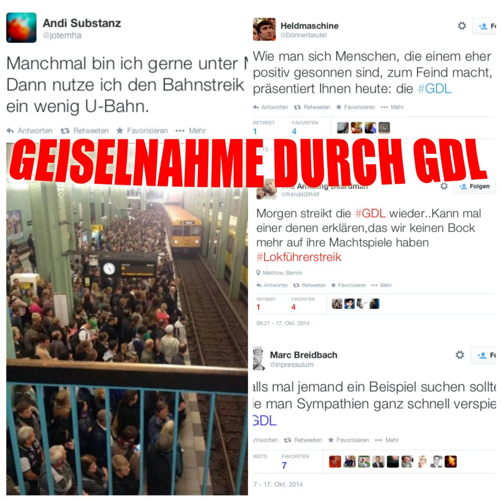 gdl1 Published on 17. Oktober 2014 in Die Selbstmord-Gewerkschaft – Bahnstreik X.0Full resolution (2000 × 2000) ← Previous “Wer streikt, stellt den Zug vor einem Signal, einer Weiche oder einfach fehlerhaft ab. Dann ist die Strecke gesperrt – auch für nachfolgende Züge, die weiterfahren wollen.” Claus Weselsky