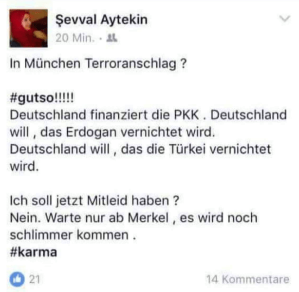 Nach dem Staatsstreich Erdogans in der Türkei wird es noch doller mit der Zensiererei auf Facebook. Nach dem Amoklauf von München postet Sevval Aytekin auf Facebook: „In München Terroranschlag? #gutso!!!!! … Ich soll jetzt Mitleid haben? Warte nur ab Merkel, es wird noch schlimmer kommen. #karma“