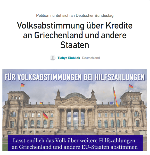 Deshalb plädiere ich an den Präsidenten des Deutschen Bundestages und die Abgeordneten: Lassen Sie das deutsche Bevölkerung abstimmen, ob weitere Kredite an Griechenland und andere Staaten vergeben werden. Ändern sie das Grundgesetz, Schaffen Sie die Voraussetzung für eine sofortige Volksabstimmung.