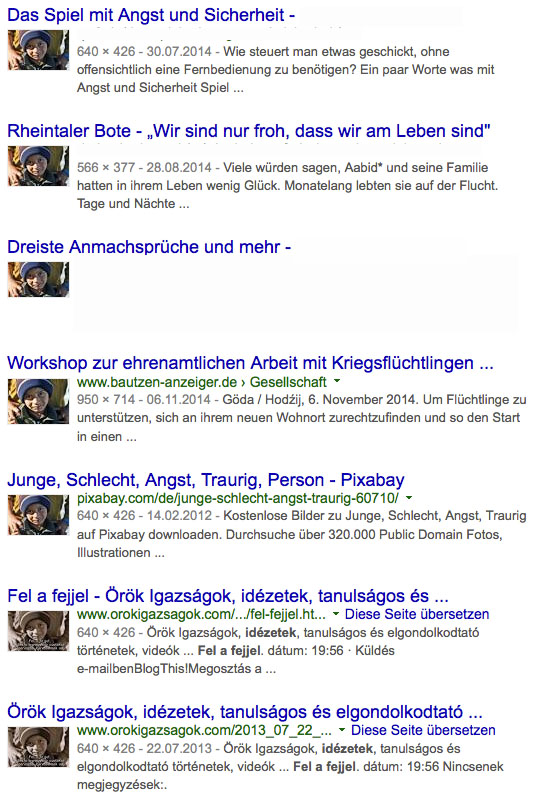 Das eigentlich Interessante: Der Text ist illustriert mit einem Foto eines Jungen – ohne Quellenangabe, mit einer eher diffusen Bildunterschrift. Ein Déjà-Vu für mich, denn dieses Bild ist mir bereits bei einer anderen Recherche im Netz begegnet. Die Google Bildersuche hilft zunächst weiter: Das Bild des Jungen führt zu einer Vielzahl von Treffern. Überall das Gleiche; keinerlei Urhebernennung, keinerlei Verweis auf eine Bildquelle. Die Nutzung des Fotos offenbart eine erstaunliche Bandbreite; von Berichten über ehrenamtliche Flüchtlingsarbeit in einer Gemeinde über Asylbewerber in Deutschland bis zu Blogs, die angebliche »Schmarotzer« anprangern, wird das Gesicht eines Kindes in unterschiedlichsten Zusammenhängen veröffentlicht. Selbst gefühlige Sinnsprüche im Sozialen Netz fehlen nicht im Sammelsurium der Suchmaschinentreffer.