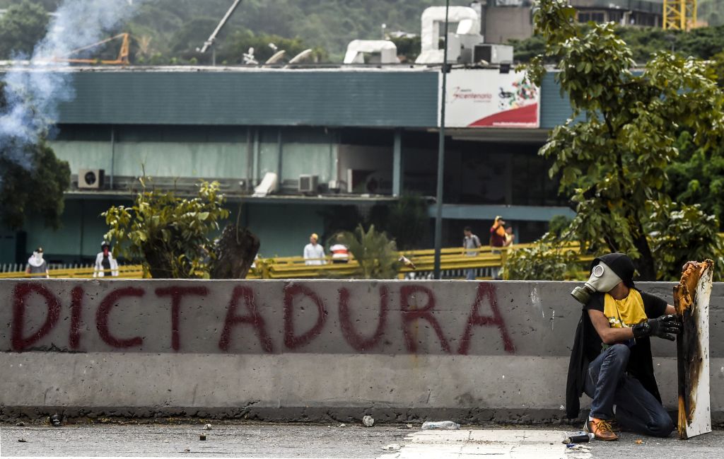 TOPSHOT-VENEZUELA-OPPOSITION-PROTEST 21. April 2017Full resolution (1024 × 649) ← Previous Next → A demonstrator crouches during clashes with riot police within an opposition protest against Venezuelan President Nicolas Maduro, in Caracas on April 20, 2017.