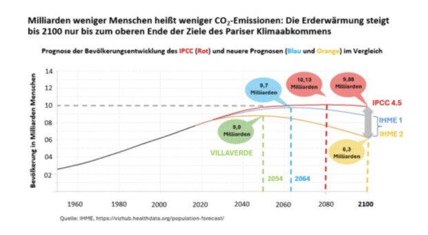 Die weltweit anerkannte Bevölkerungsforschungseinrichtung der Universität von Washington IHME geht in einer oberen Schätzung von einem Peak von 9,7 Milliarden Menschen in 2064 aus (siehe Grafik blaue Kurve). In einer unteren Schätzung (gelbe Kurve) gehen sie von einem Peak von rd. 9 Milliarden Menschen in 2054 aus. Diese untere Schätzung wird von dem Demographieexperten Jesus Fernandes-Villaverde von der Universität von Pennsylvania gestützt. In 2100 würden demnach etwa 3,5 Milliarden Menschen weniger auf der Erde leben als das IPCC annimmt.