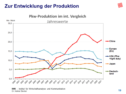Bereits im Jahre 2000 ging die Wachstumsära in Deutschland zu Ende. Über 20 Jahre dümpelten die Neuzulassungen seither unter geringen zyklischen Schwankungen jährlich zwischen 3,3 und 3,1 Millionen, lediglich einmal – im Jahr 2009 durch die Abwrackprämie – mit einem Höchstwert von 3,8 Millionen noch oben wie durch einen Tiefststand von 2,9 Millionen im Folgejahr 2010 nach unten unterbrochen. Vergleichbar auch die Pkw-Produktion, die stets zwischen 5,0 und 5,5 Millionen pendelte.