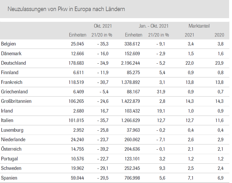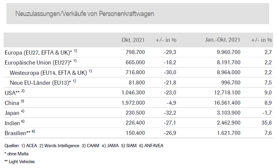 Im Oktober 2021 mussten die internationalen Automobilmärkte erhebliche Rückgänge hinnehmen: