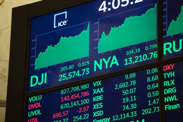 A board displays the closing numbers after the closing bell of the Dow Industrial Average at the New York Stock Exchange on January 11, 2018 in New York. Wall Street stocks finished at fresh records Thursday behind gains in industrial and petroleum-linked equities, resuming their upward climb after a one-day pullback. At the closing bell, the Dow Jones Industrial Average stood at 25,574.73, up 0.8 percent. The broad-based S&P 500 gained 0.7 percent to 2,767.56, while the tech-rich Nasdaq Composite Index advanced 0.8 percent to 7,211.78.